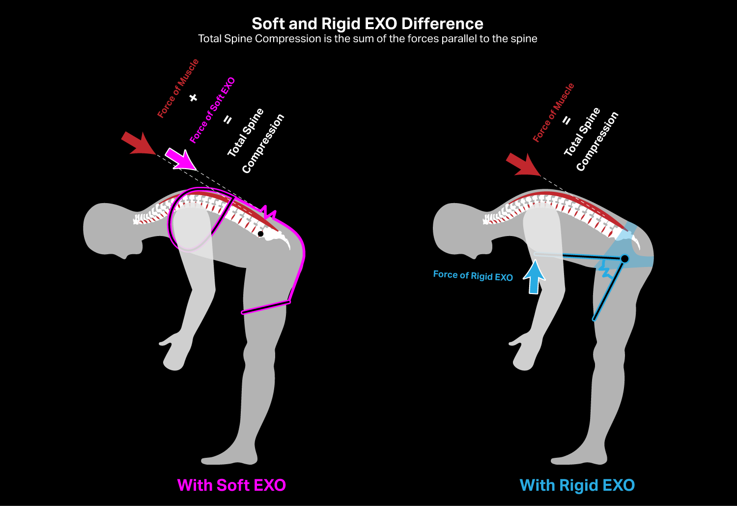 This chapter explains why Laevo thinks it is highly plausible that different types of exoskeletons have large differences in efficiency when it comes to reducing spine compression. There are many more types of exoskeletons, but below we will focus on the soft (also called exosuits) and rigid exoskeletons (such as the Laevo exoskeletons), characterized by: